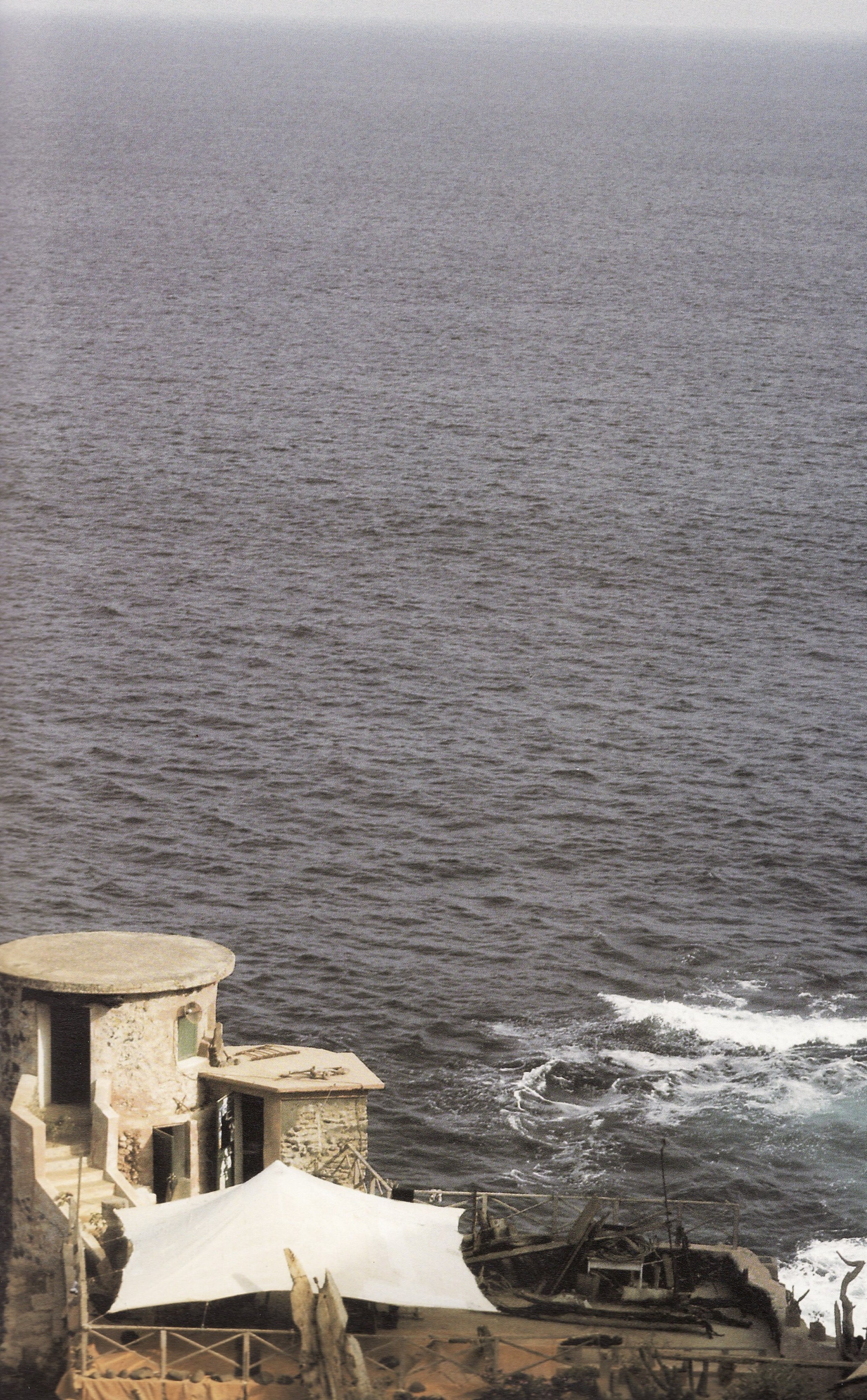 Le dos à la terre la mère, le corps noué sous une toile attachée aux pierres d’une bâtisse grise, vestige et maintenant refuge l’homme et le fort regarde la barrière d’eau , la voile bleu , la toile qui bouge au vent ou halo de lumière en flot, les yeux voient au loin , quoi , le dos au rivage mère les yeux arpente ce désert des vies qui pourtant rejette ces disloqués, ces voisinages d’aventures , ces embruns d’ailleurs,
