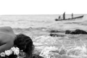 es tu jeune fille sur ton parterre de rose, roses blanches comme l’habit voile blancheur que tu as ôté, sur lequel tu reposes de la fatigue des grands vents, chevauchées de la flotte s’il faut être bref et que vogue la coque, l’aile de tissus ne vole plus, es tu endormie Sirène, fille de Iémanja égale de MamyWata , d’où ta féminité s’ouvre coquillage ou baiser dans ton sommeil les lèvres ensemencent entre les vagues et les fleurs que le bateau à l’entrave repousse, coupant en travers des courant qui mènent à Praia, de l’ovale le long de tes cils apeurée sur le sable où battent les paupières, la larme vers l’eau ouvre le passage aux eaux de l’enfantement, l’océan, peut être que tu contemples s’embrume dans la largeur.
