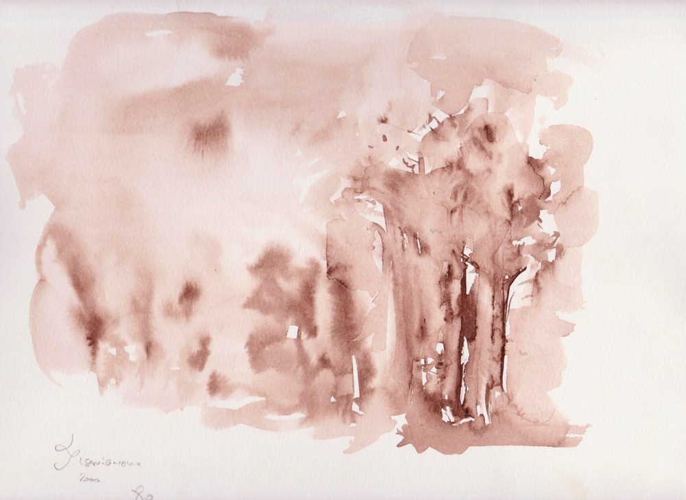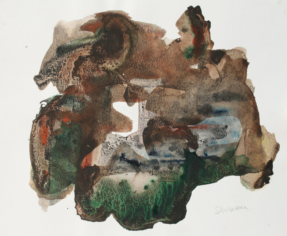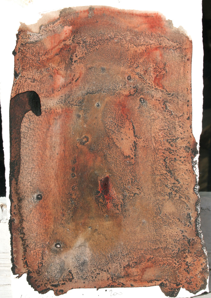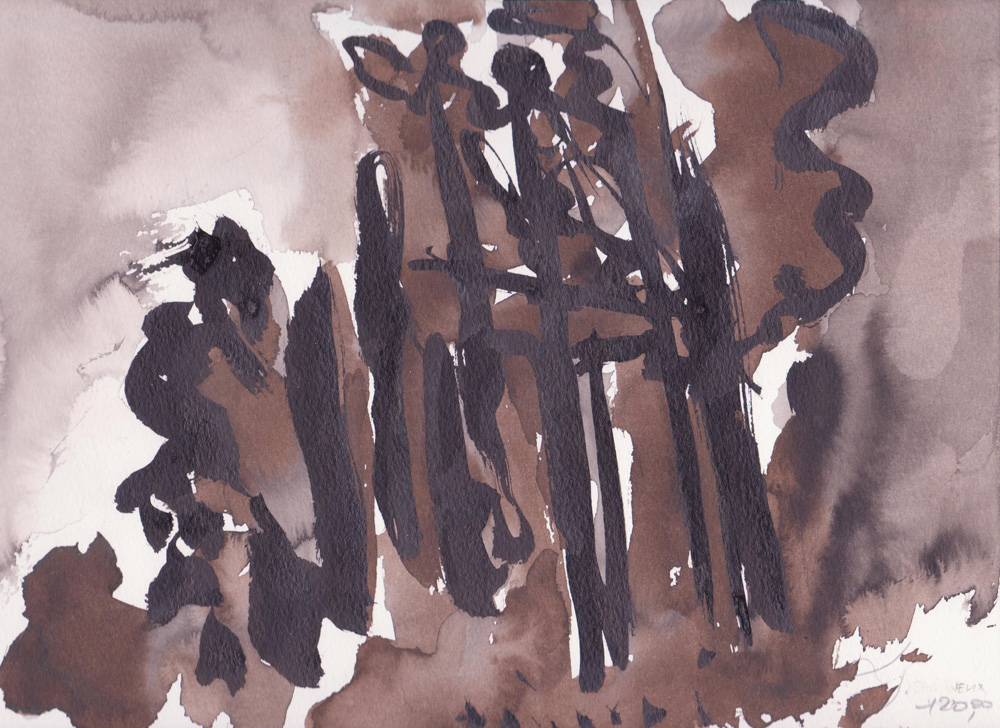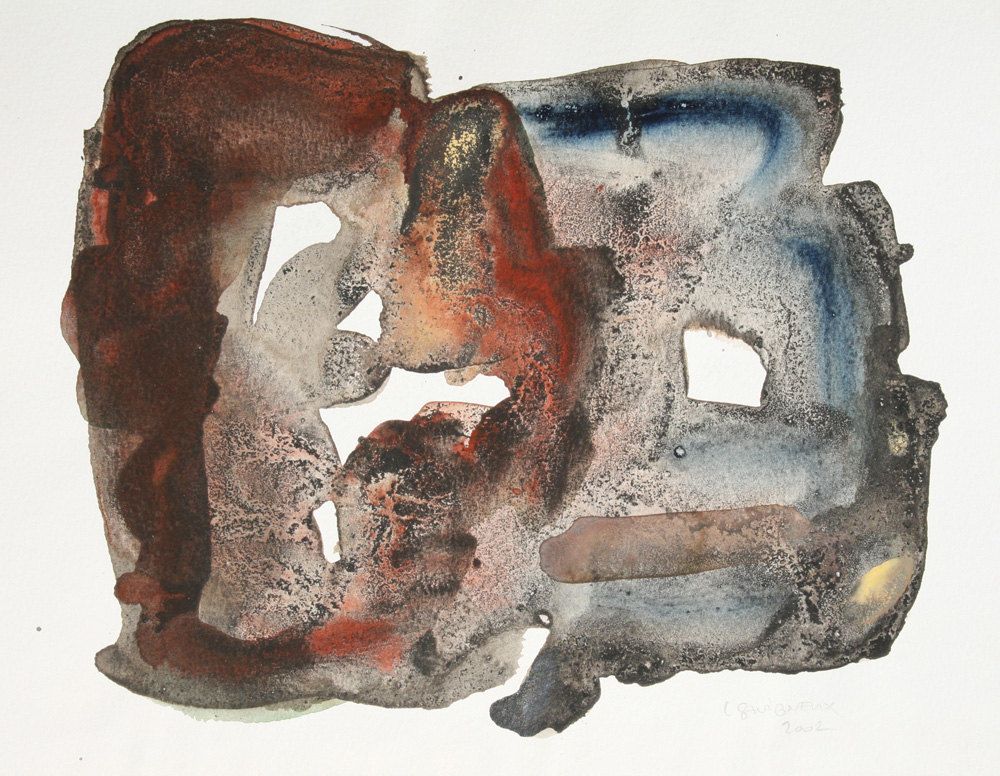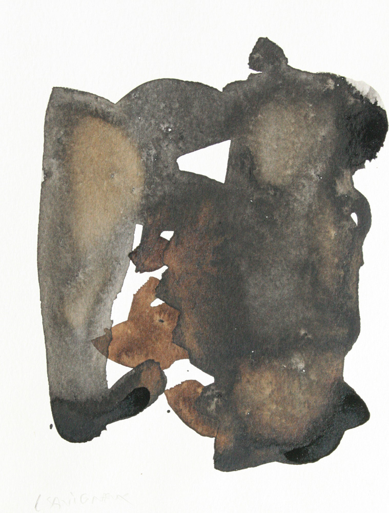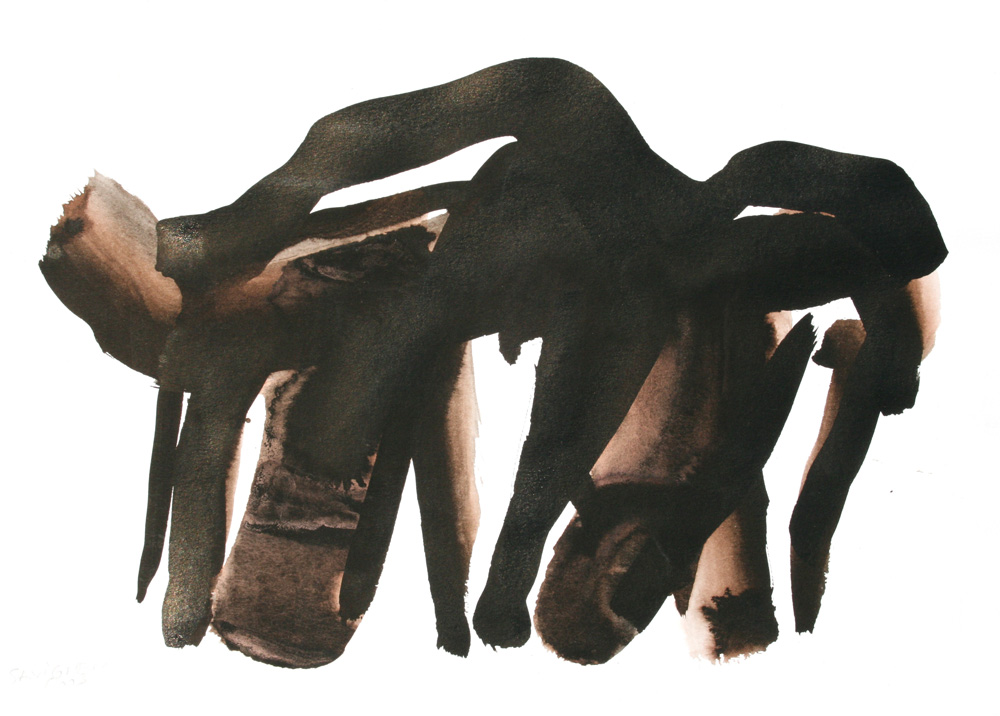 La densité et la manière brute, opaque, la matière du noir et de la masse prennent place dans une incarnation du primitif en soi, en moi, comme langue perdue, ancienne et inarticulée, un fonds que les surgissement des profondeurs permettent d’articuler. Travail réalisé en même temps que les recherches à la gouache sur la germination et la terre primordiale. Les chants de Beñat Achiary m’ont accompagné et ce travail est dédié à mes origines basques.