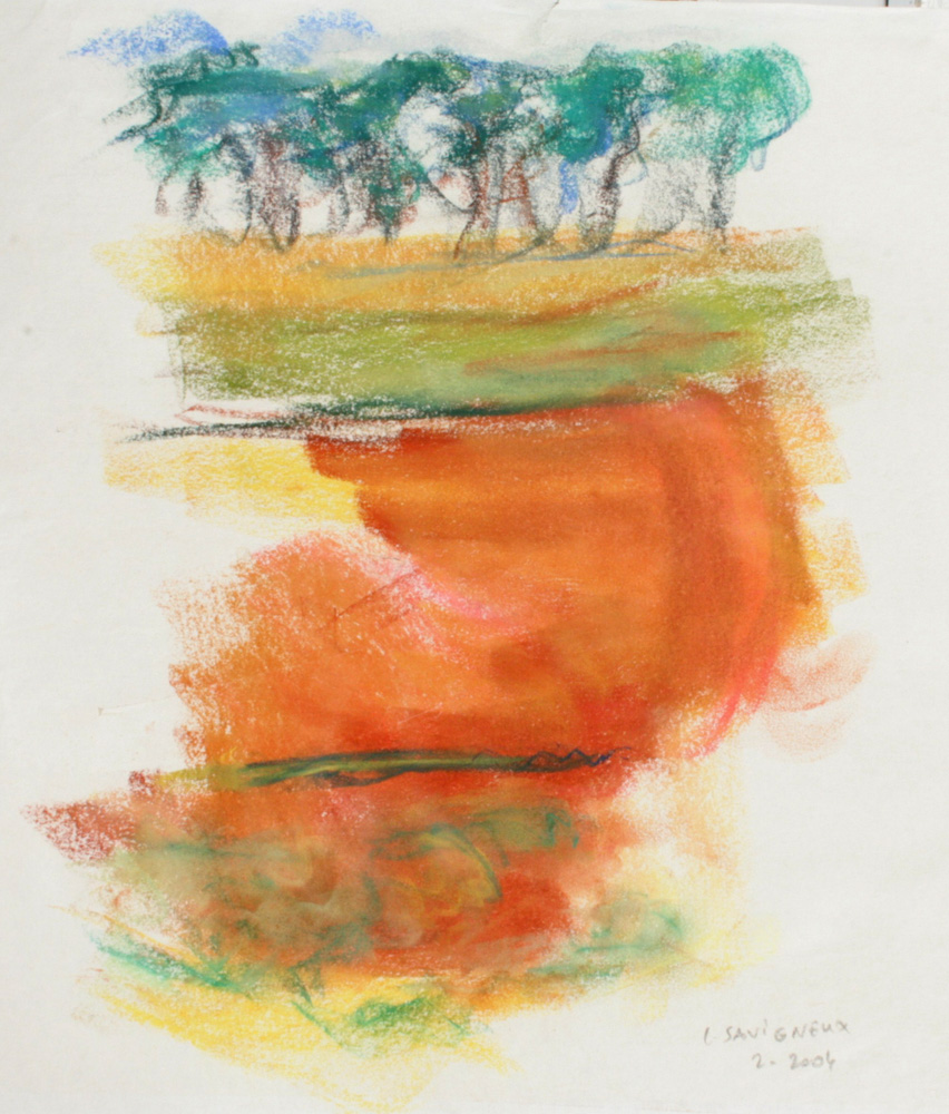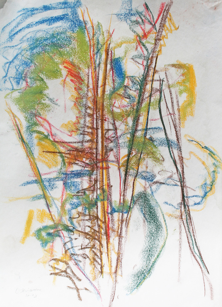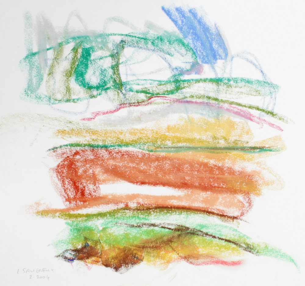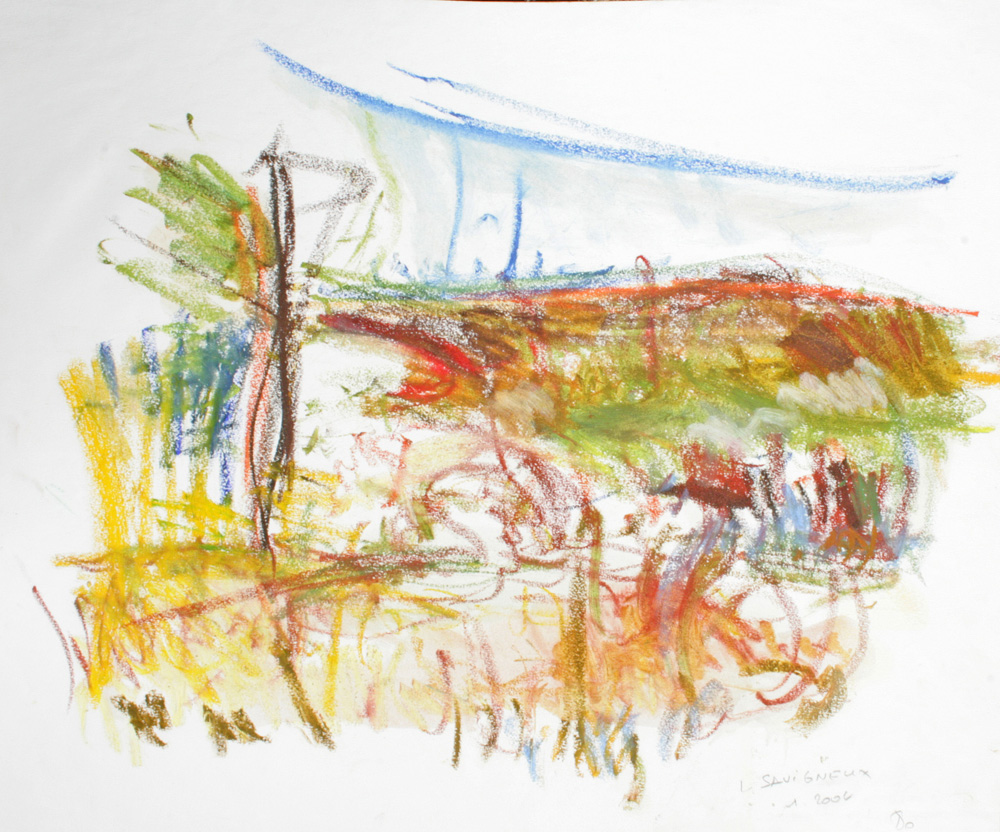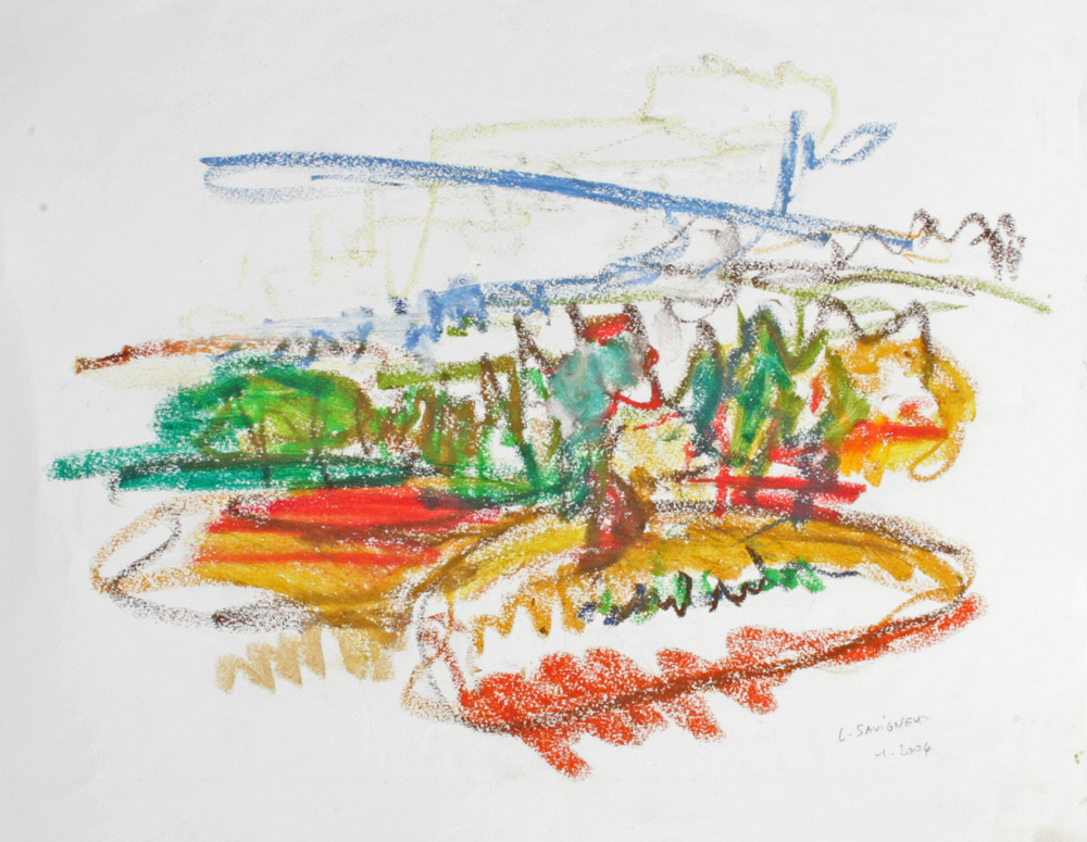 C’est le rythme et la dynamique fébrile du pastel comme une écriture du vivant comme pressé de devenir ou de pousser à ses limites. Pastel gras et pastel sec sont jouissif dans leur utilisation et permettent au geste d’imprégner le papier de leur élan. Pour moi depuis le début, le thème de l’entour et de la poussée dans l’espace ont été primordiaux, à la façon d’un raga qui au fil du temps s’étoffe. Le souvenir passionné de deux grands maîtres admirés aux Etat Unis lors de mon séjour à Yale, Mark Rothko et Joan Mitchell a cristallisé leur empreinte sur ma réflexion. Mais cette peinture est une pratique du grand air et n’a rien de la distance de l’atelier, au contraire, ici le réel dicte directement les impressions comme la lumière.